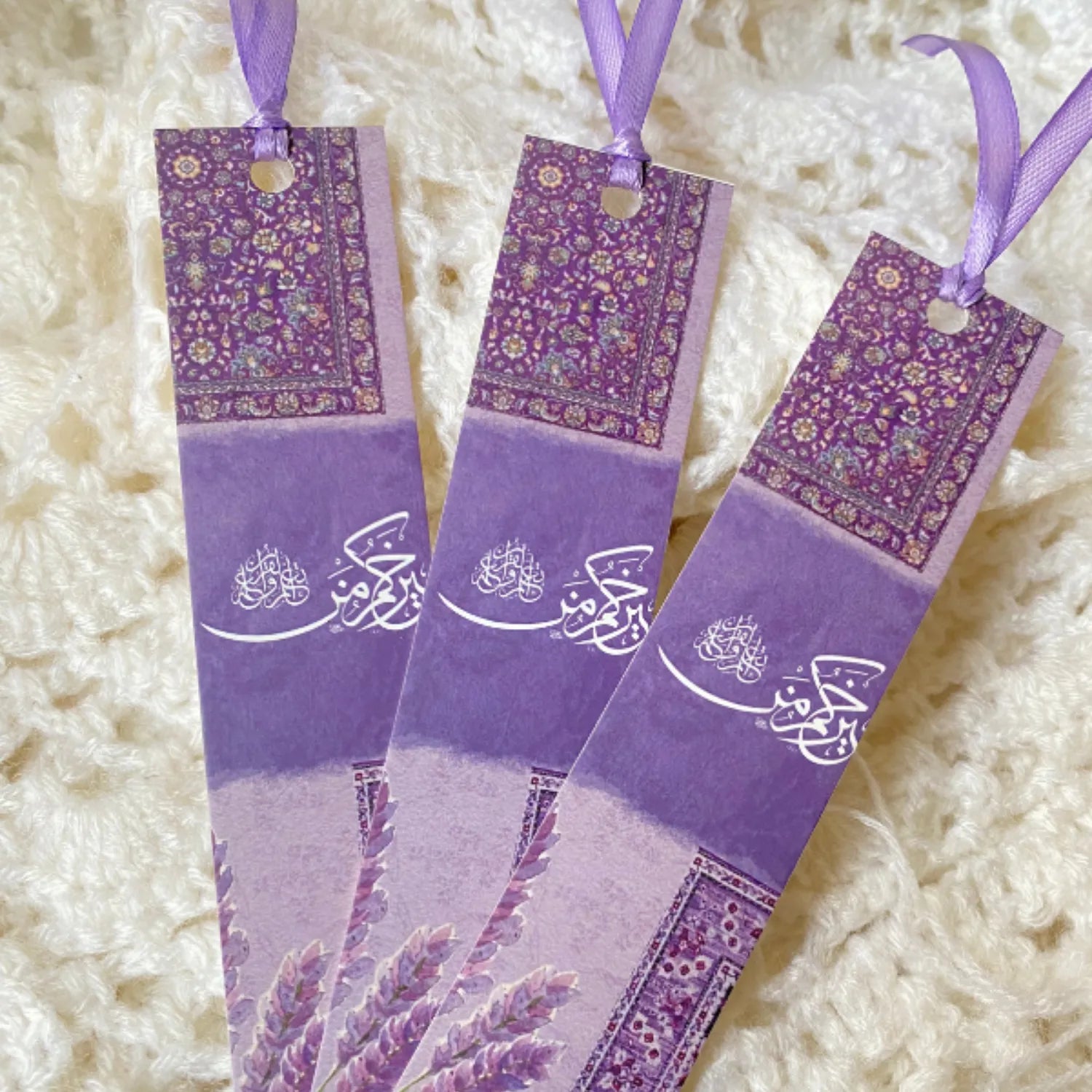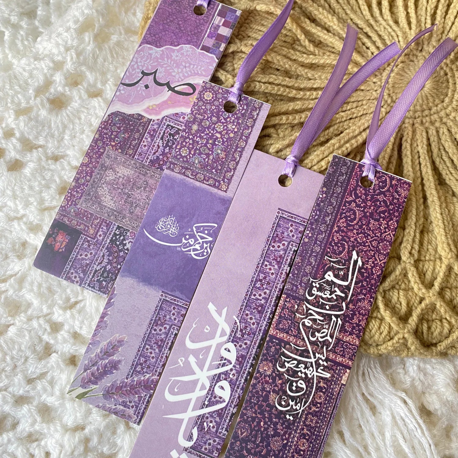 Mark your pages with beauty and intention using these exquisite "Sabr" (Patience) Bookmarks. Each piece features a rich, layered design inspired by traditional prayer rug textures, utilizing a stunning palette of deep violets, lilacs, and royal purples.