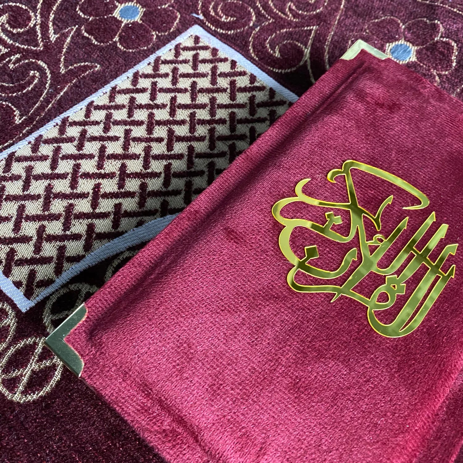 The corners are reinforced with polished gold metal protectors, ensuring long-lasting durability while enhancing its royal aesthetic. Paired with a matching prayer mat, this Quran Pak is perfect for those who appreciate fine craftsmanship in their spiritual essentials. Whether it is for daily recitation, a thoughtful wedding gift, or a precious addition to a Hajj/Umrah gift set, this velvet-bound Quran serves as a stunning reminder of faith and beauty.